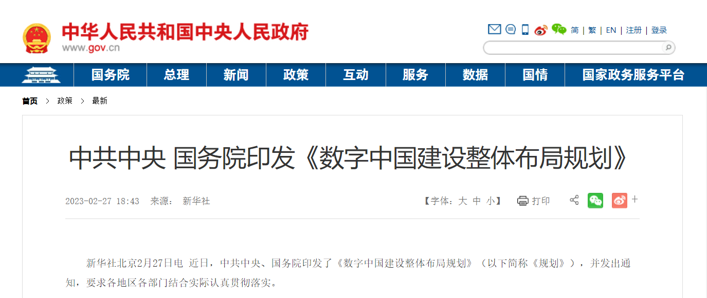 近日,中共中央、國(guó)務(wù)院印發(fā)了《數(shù)字中國(guó)建設(shè)整體布局規(guī)劃》(以下簡(jiǎn)稱(chēng)《規(guī)劃》),并發(fā)出通知,要求各地區(qū)各部門(mén)結(jié)...