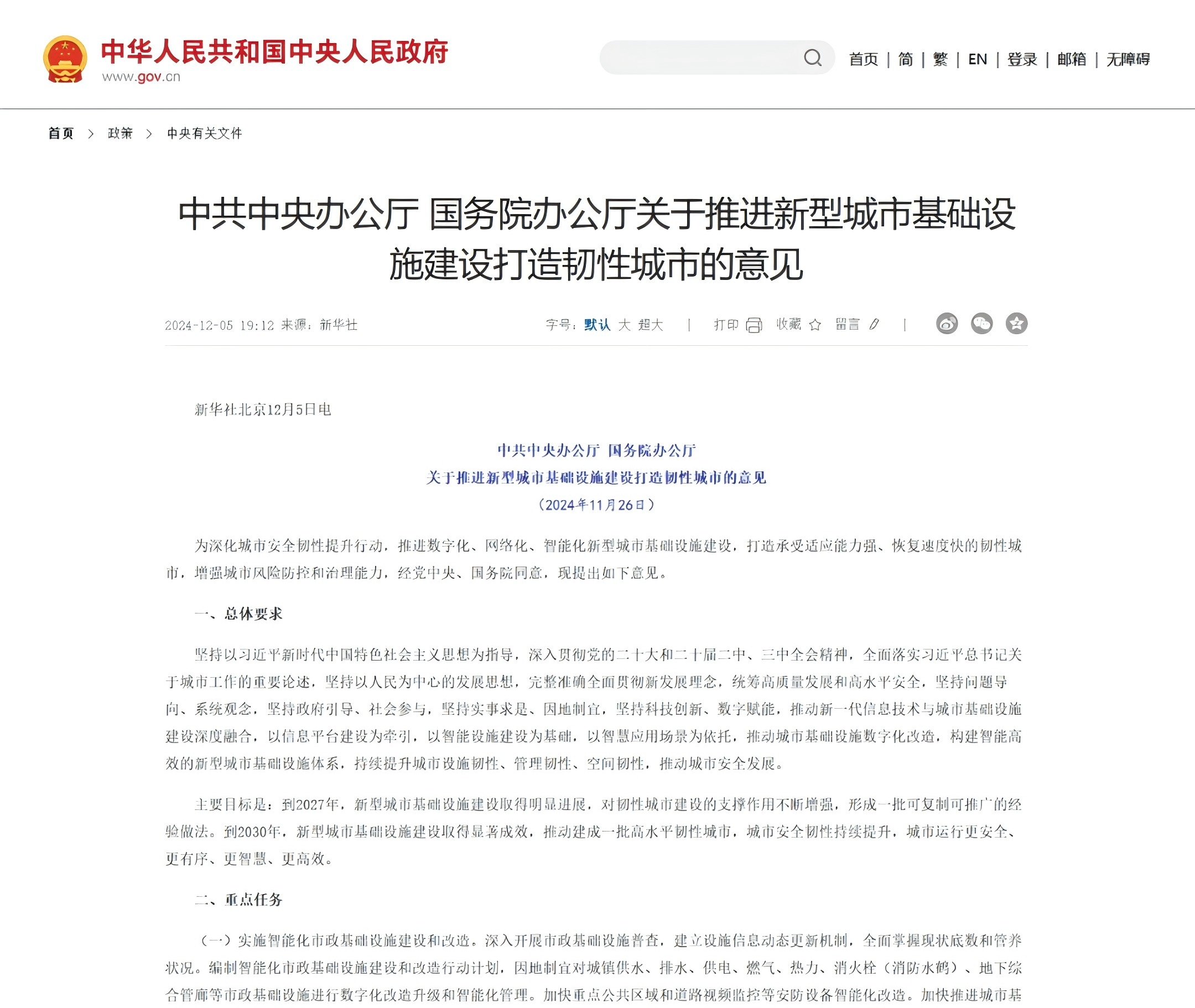 2024年12月5日,中共中央辦公廳、國務(wù)院辦公廳發(fā)布了《關(guān)于推進新型城市基礎(chǔ)設(shè)施建設(shè)打造韌性城市的意見》,明...